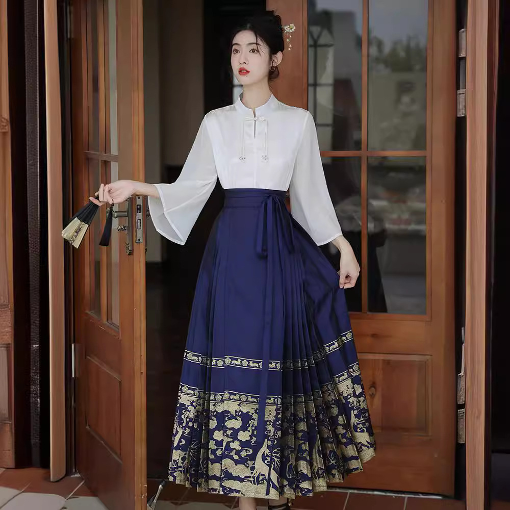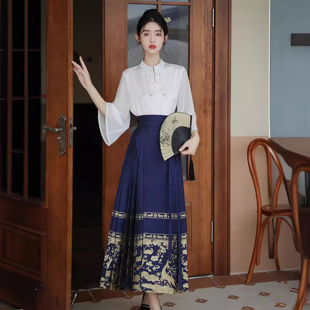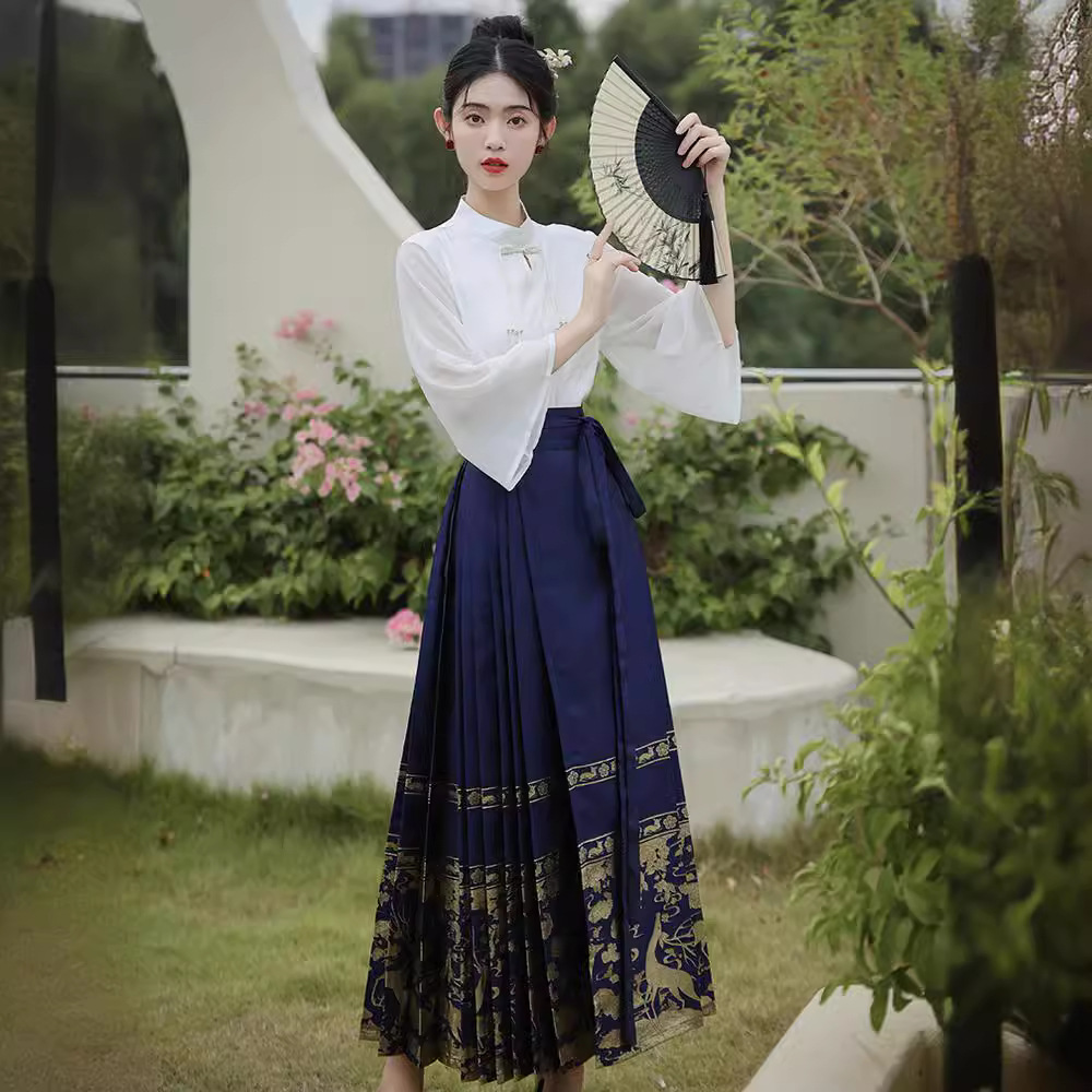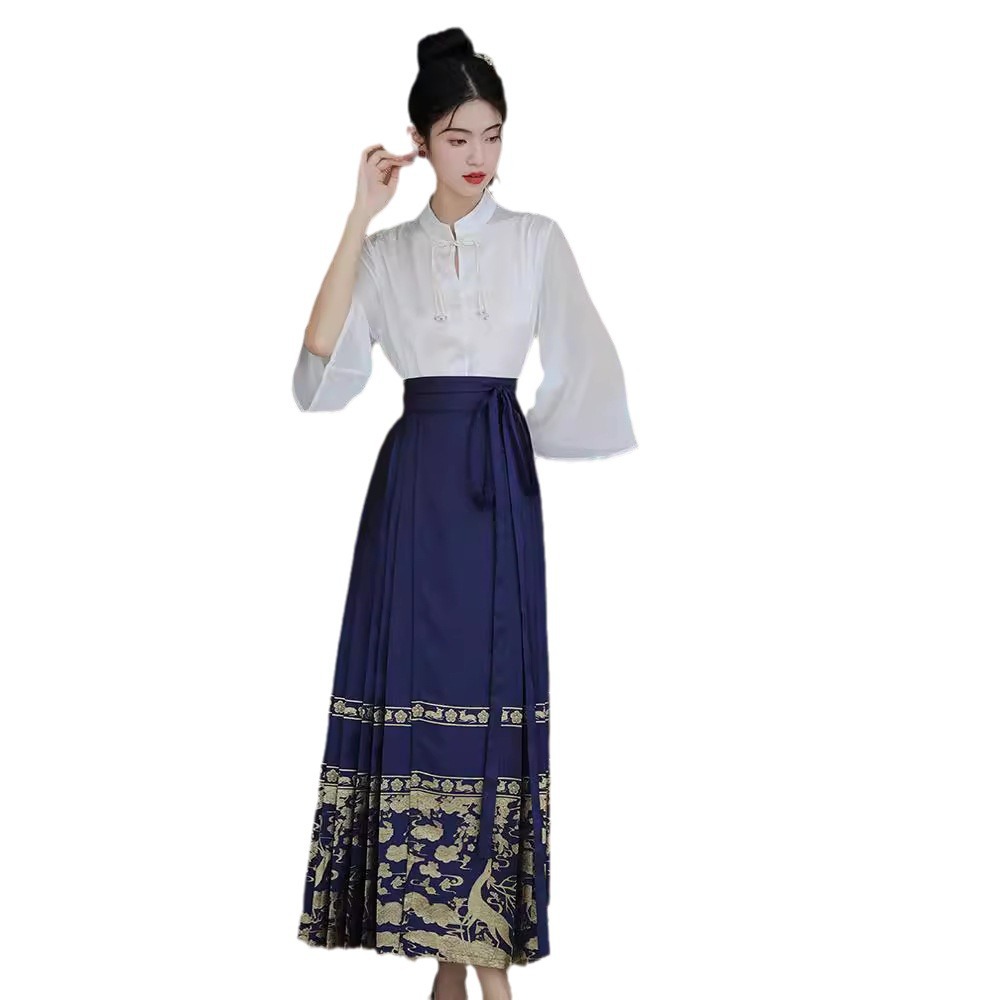 | nameOriginal | Improved New Chinese style Chinese style hanfu women's fairy deer Xiangyun woven gold satin jacquard lace-up dark blue vest skirt suit |