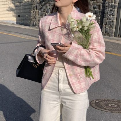 | nameOriginal | In stock 2023 Autumn New South Korea Dongdaemun LER * BE tweed plaid loose lapel Chanel style coat |