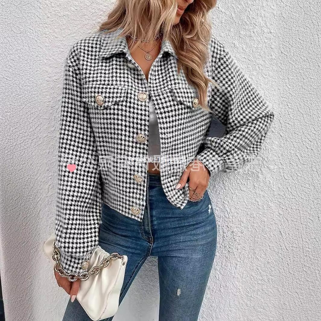 in stock Amazon ebay autumn and winter women’s coat lapel single-breasted houndstooth jacquard jacket commuter coat women