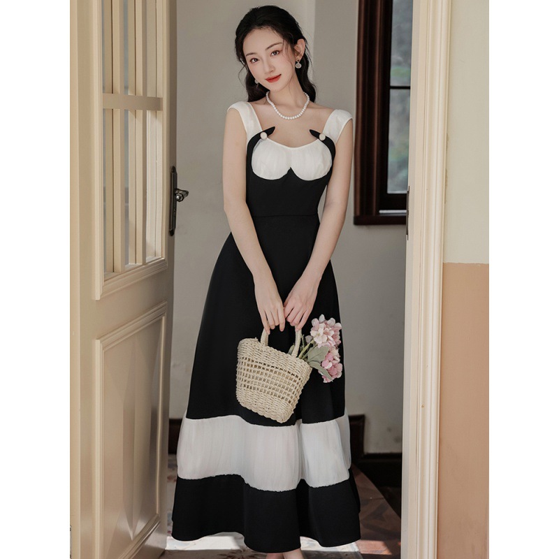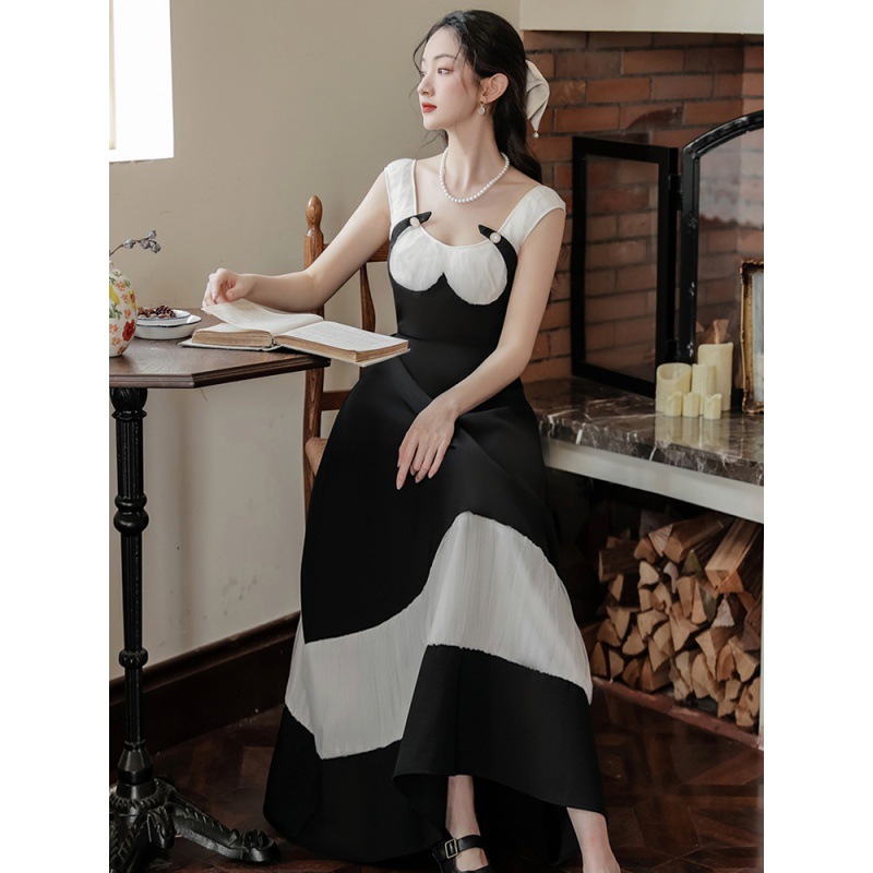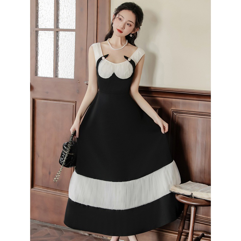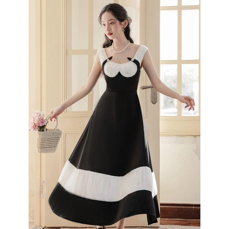 | nameOriginal | in stock Black and White Two-Tone Colorblock Pleated Buckle Retro Elegant Umbrella Dress |