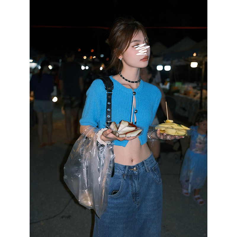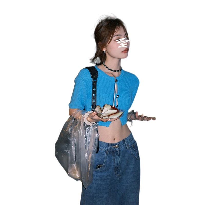| nameOriginal | in stock] Blue Knitted Cardigan Women's Summer Design Round Bead Hollow Short-sleeved T-shirt Chic Short Top |