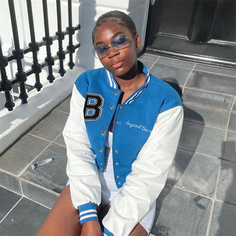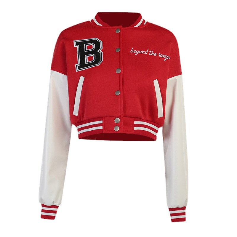 In stock color matching printed leather sleeves slim stand collar baseball uniform short coat Women’s European and American autumn and winter Japanese jacket