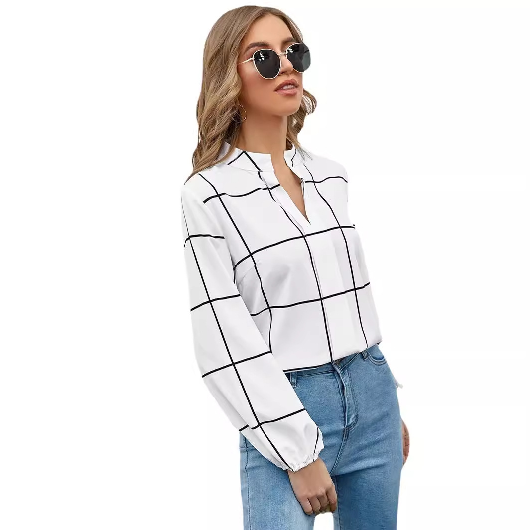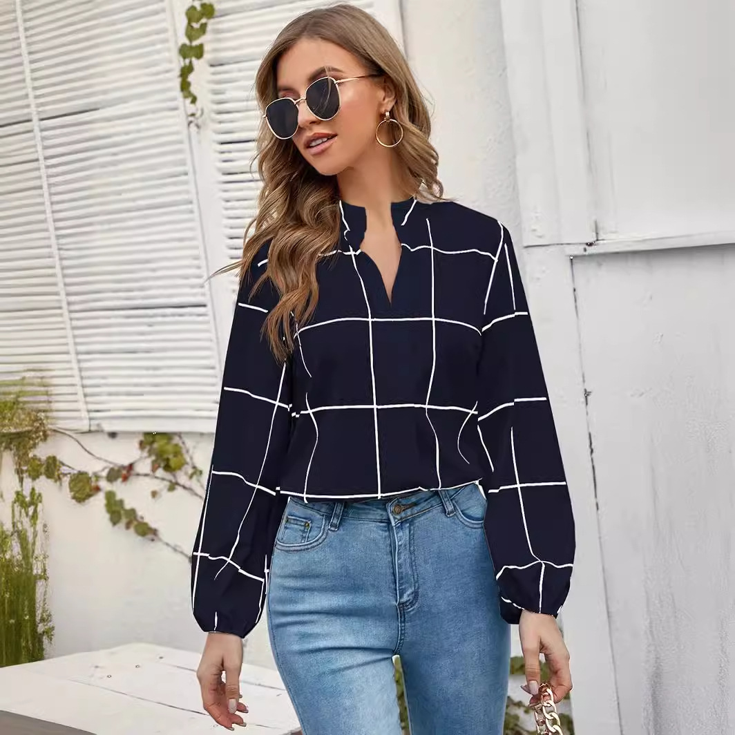 | nameOriginal | In stock cross-border Amazon autumn elegant ins style shirt stand collar long sleeve plaid printed chiffon women's shirt |