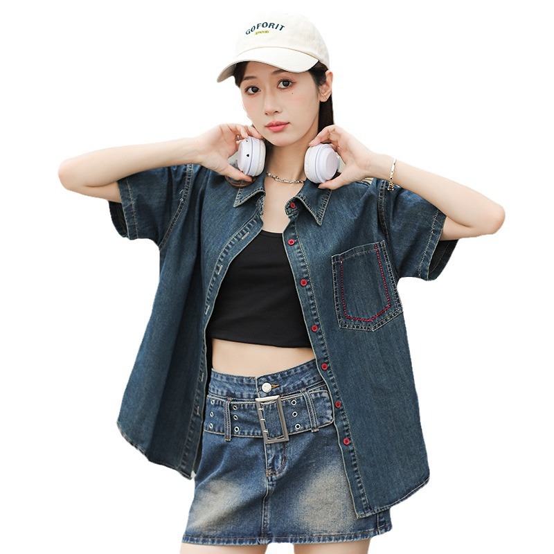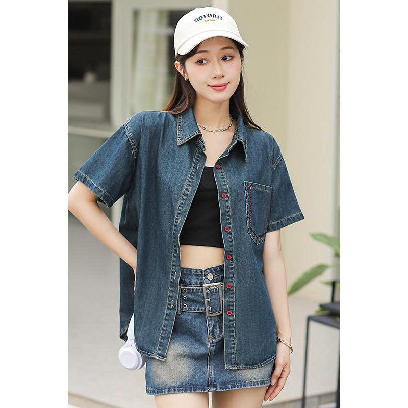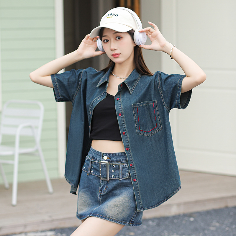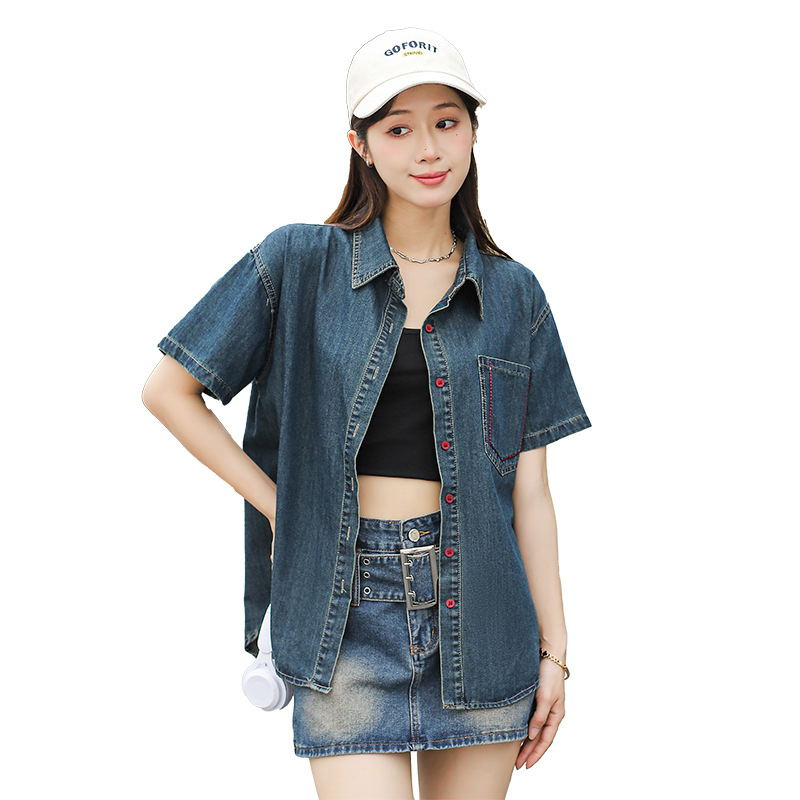 | nameOriginal | in stock Hong Kong Style Denim Shirt Women's Summer Retro High-end Elegant Casual All-match Slim-fit Top Shirt |