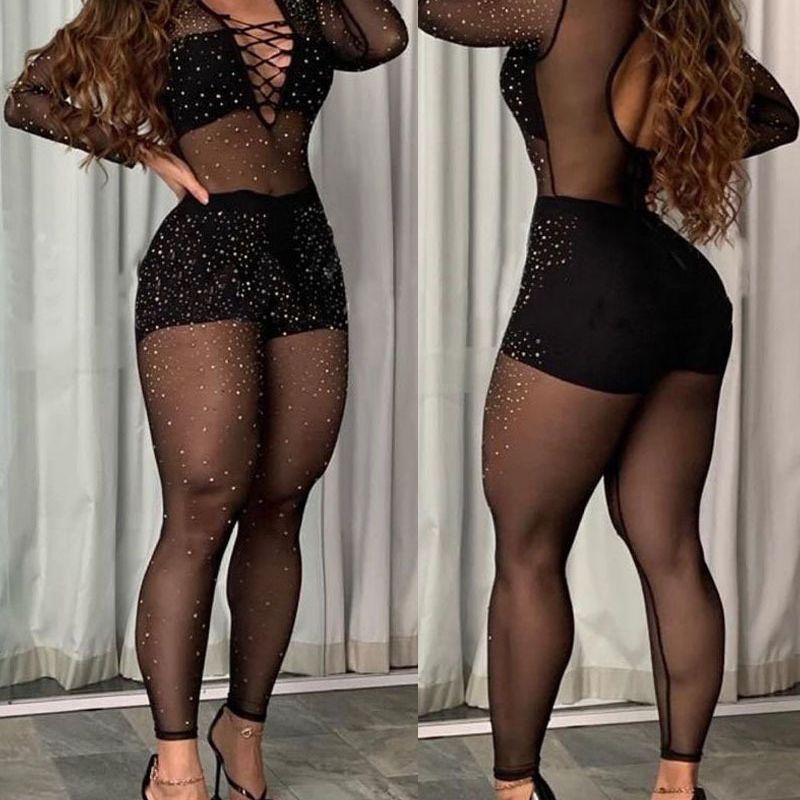 In stock ODS1129 cross-border e-commerce independent station European and American women’s hot drilling lace-up mesh jumpsuit