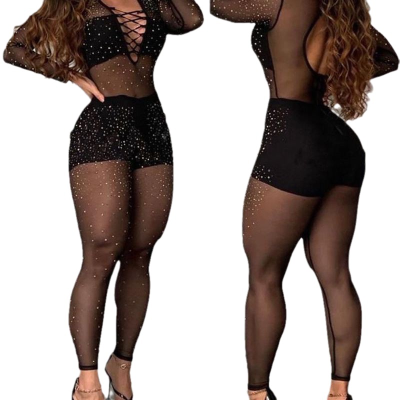 In stock ODS1129 cross-border e-commerce independent station European and American women's hot drilling lace-up mesh jumpsuit
