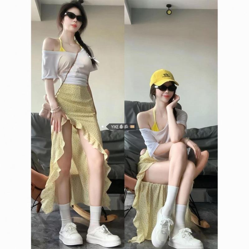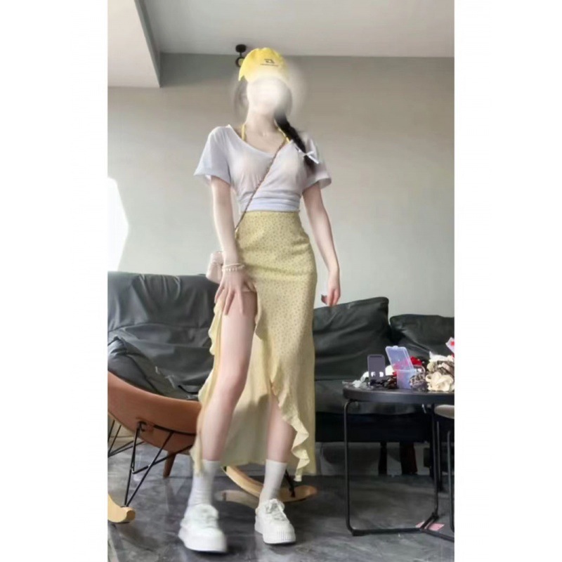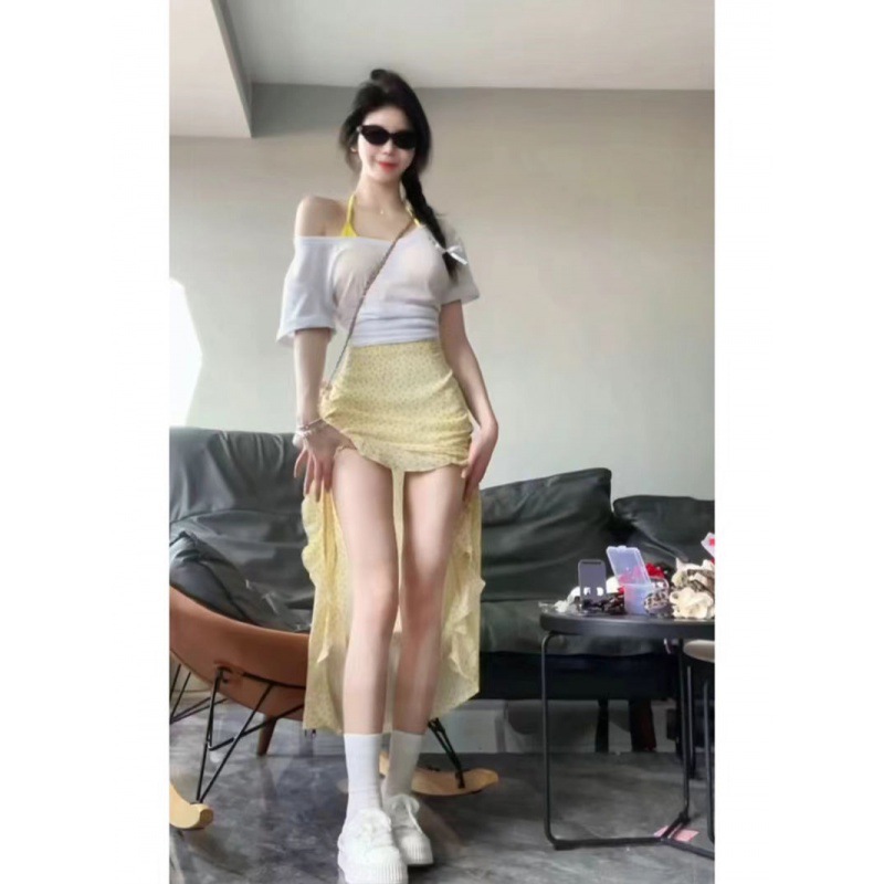 | nameOriginal | [in stock] Pure Desire Style Spice Girl Irregular Yellow Floral Skirt suit Women's Summer All-match Short-sleeved Top |