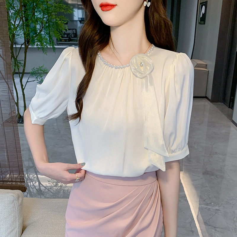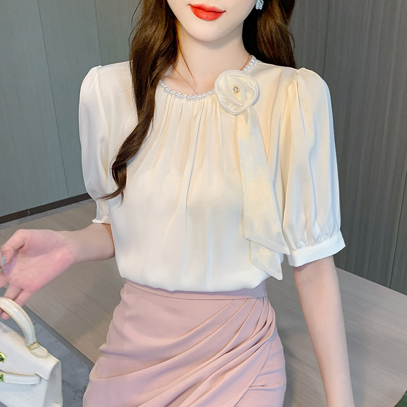 in stock Real Shot 2024 Summer New Round Neck Rose Decoration Beaded Short Sleeve Satin Shirt Women's Top for Summer