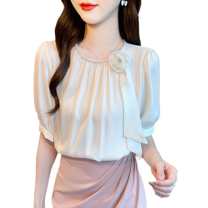 in stock Real Shot 2024 Summer New Round Neck Rose Decoration Beaded Short Sleeve Satin Shirt Women’s Top for Summer