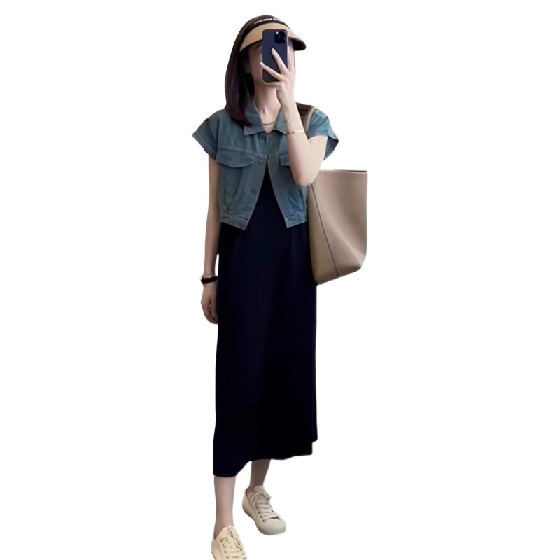 in stock summer tea department wear a set of small age reduction pregnant women Denim coat strap dress suit