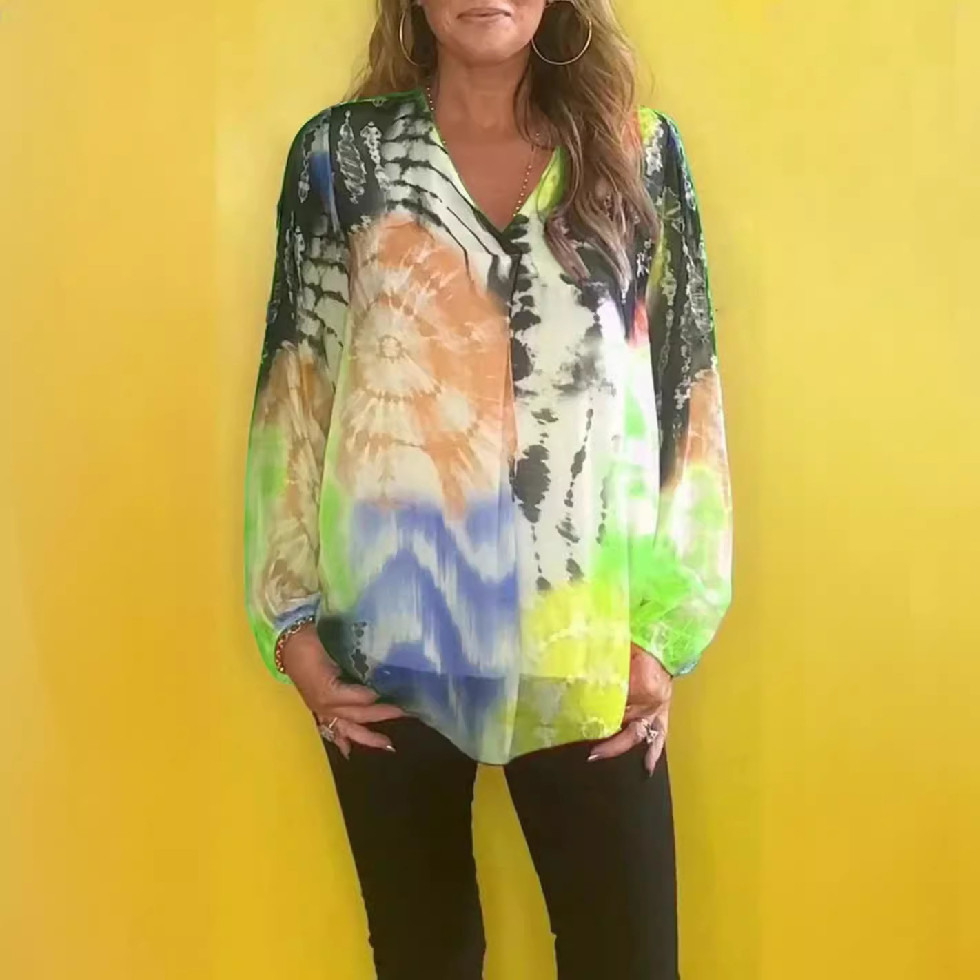 | nameOriginal | Independent Station 2024 European and American Cross-border Leisure Tie-dye Printing Multicolor plus size Women's V-neck Long Sleeve Women's Shirt |