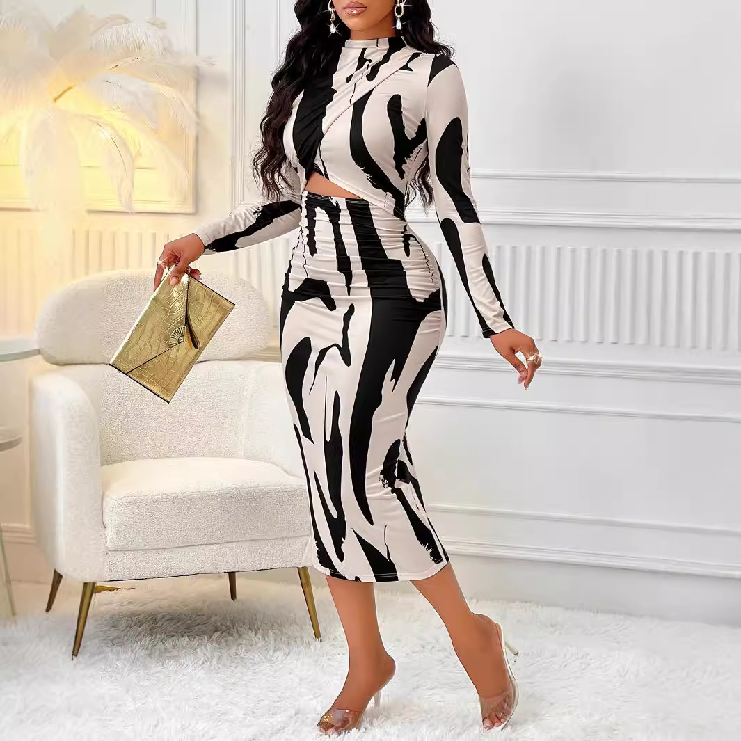 Independent station new temu Amazon AliExpress European and American women’s fashion printing long sleeve hip dress temperament
