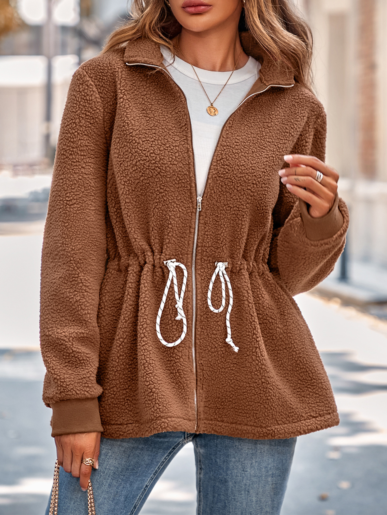 Independent station winter casual women's clothing 2023 European and American new stand collar solid color lace-up waist tight long sleeve plush coat