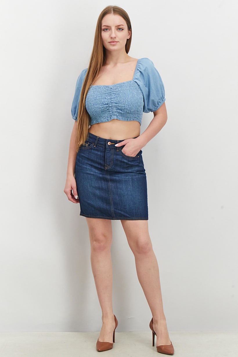 | nameOriginal | Women Solid Denim Mini Skirt, Indigo |