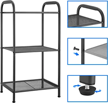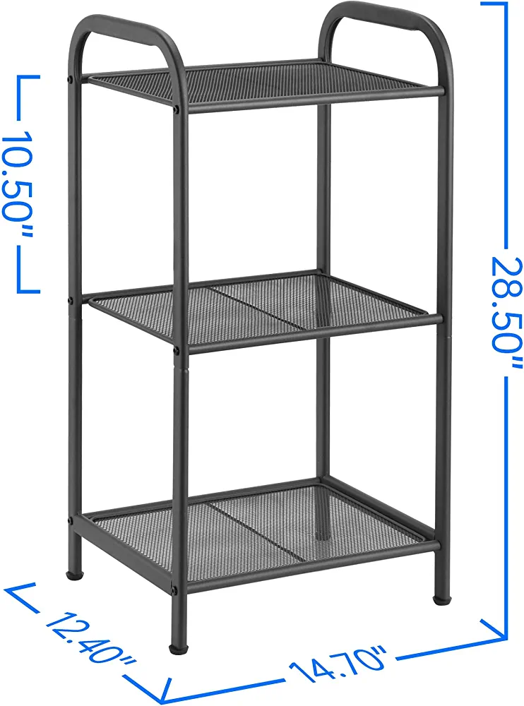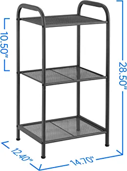 Dimension & Material: The size of this shelf is 14.70 x 12.40 x 28.50 inches, which is mainly composed of several reinforced metal pipes and wire mesh.