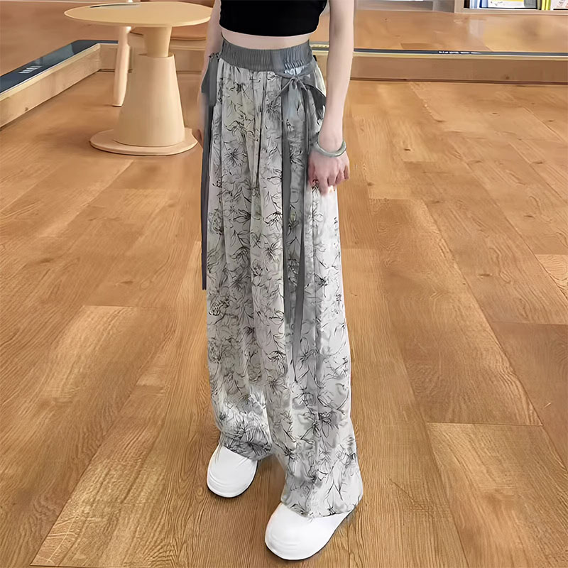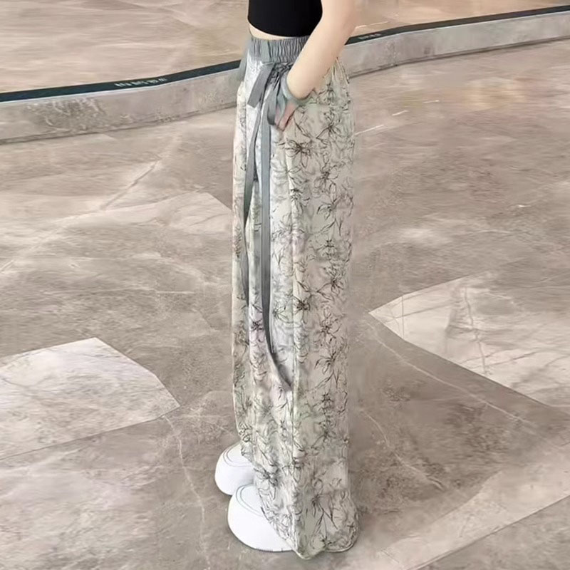 Ink Flower Ice Silk Wide Leg Pants Women's 2024 Summer New Thin High Waist Dagging plus size Loose Straight Pants