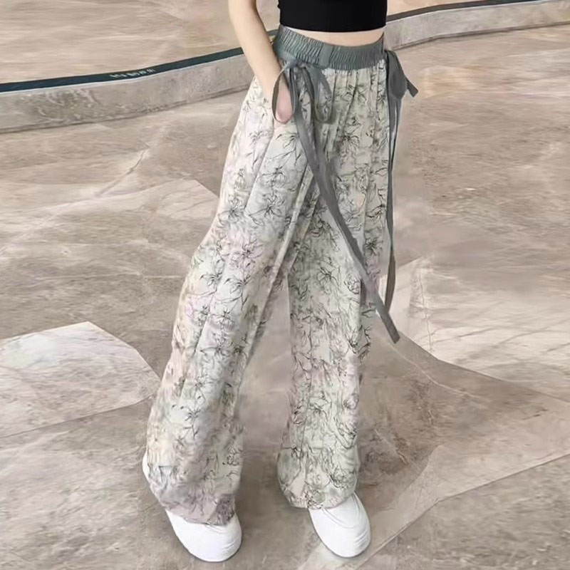 Ink Flower Ice Silk Wide Leg Pants Women’s 2024 Summer New Thin High Waist Dagging plus size Loose Straight Pants