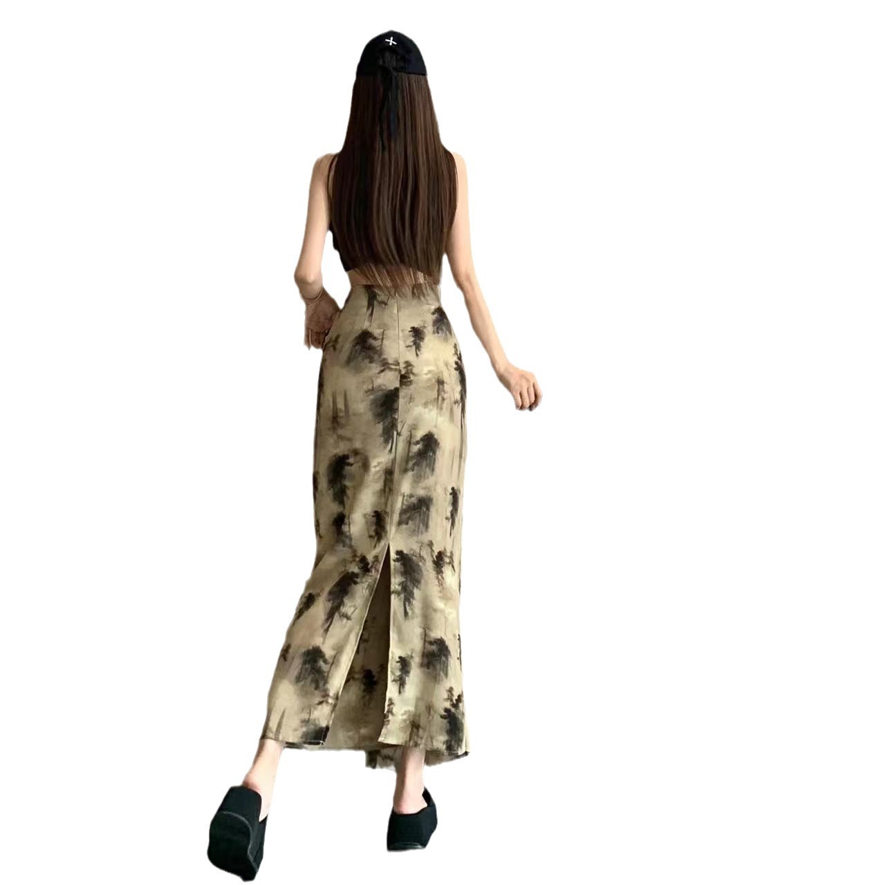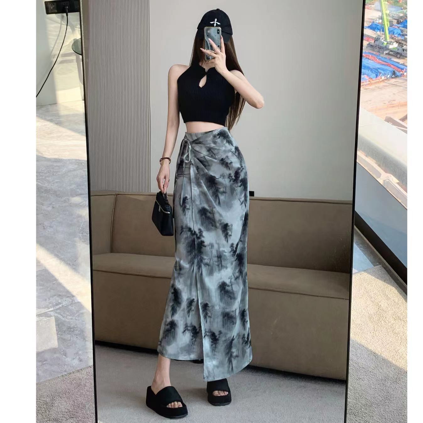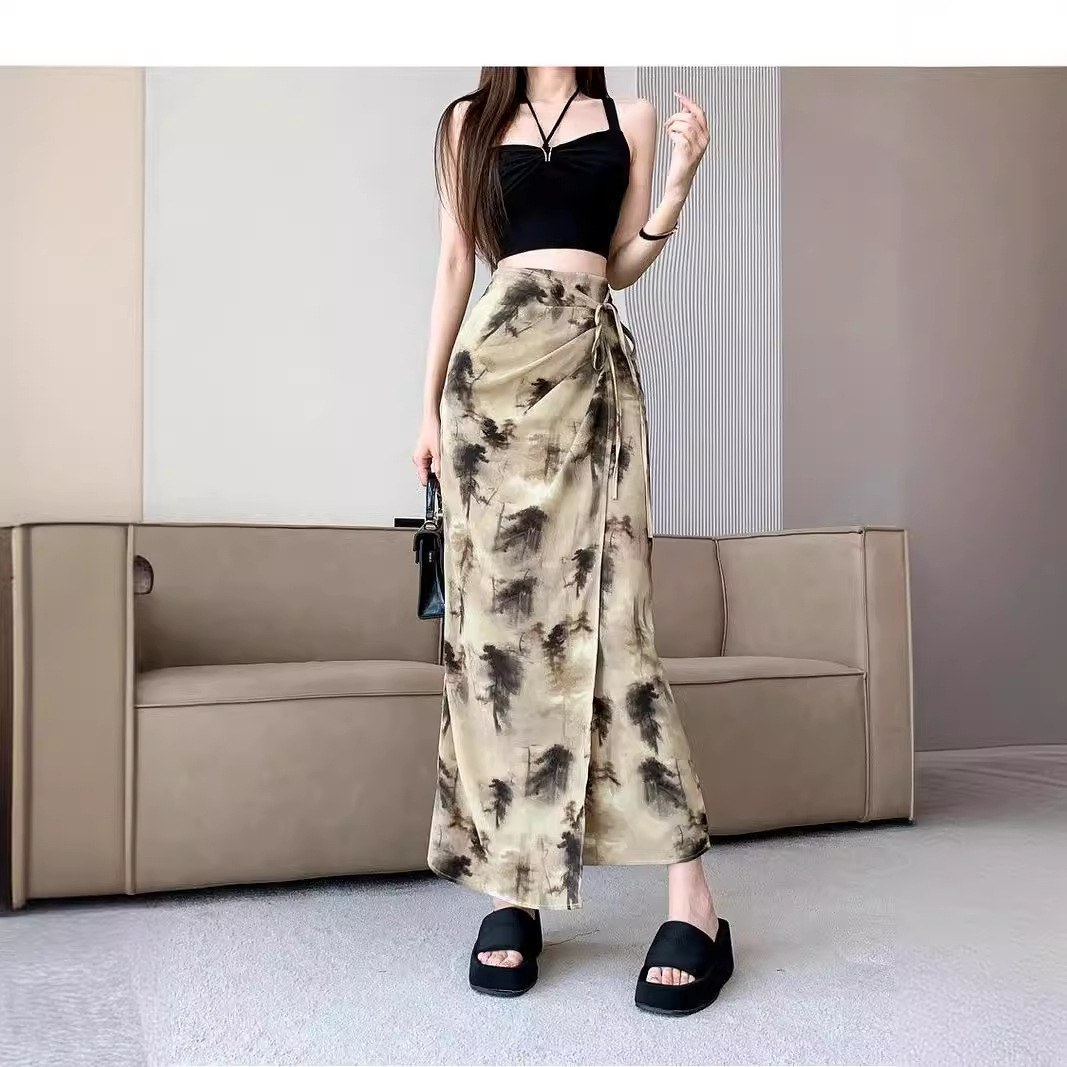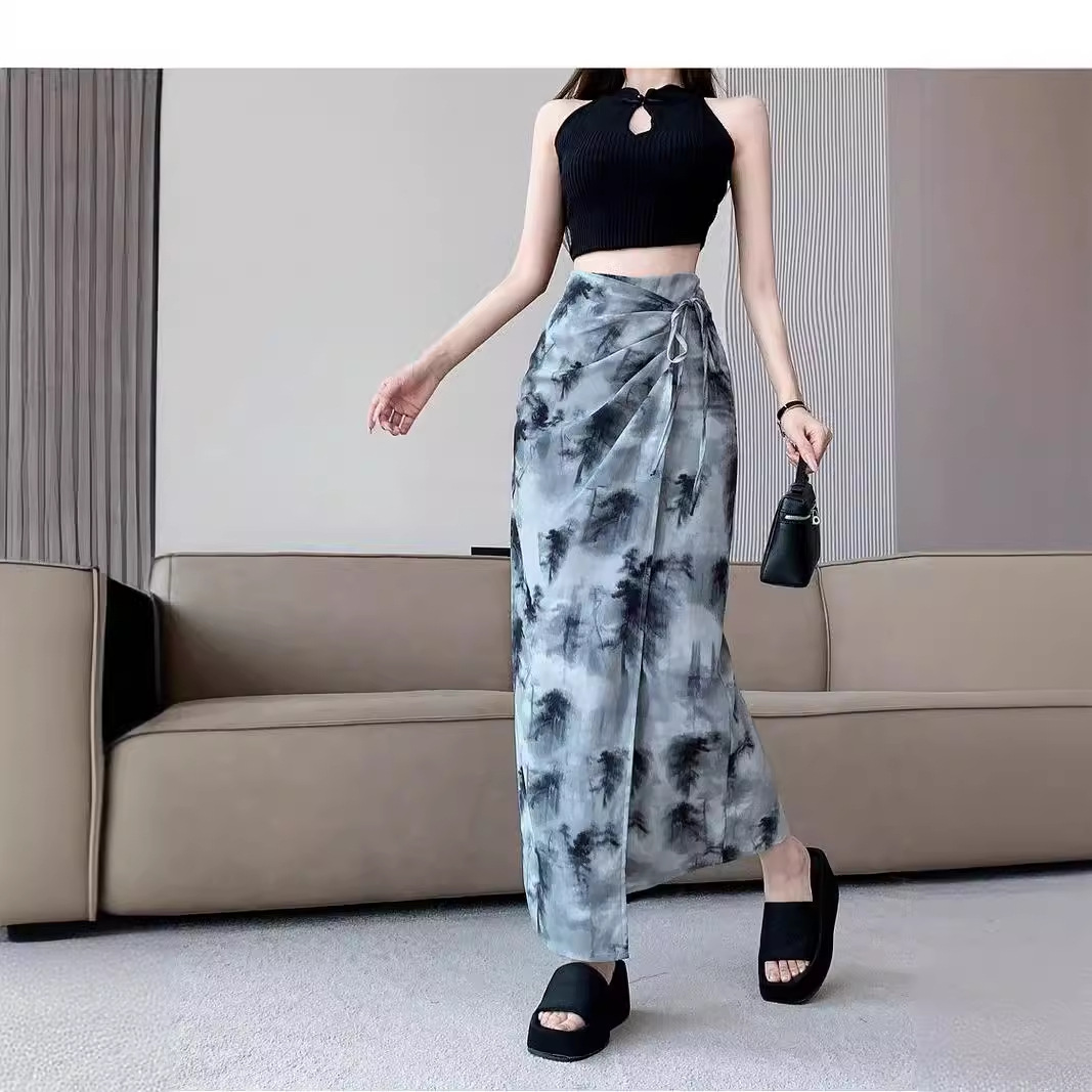 Ink Painting Chiffon One-piece Skirt Women’s Summer Lace-up Hip Skirt Rear Split Irregular Straight Skirt