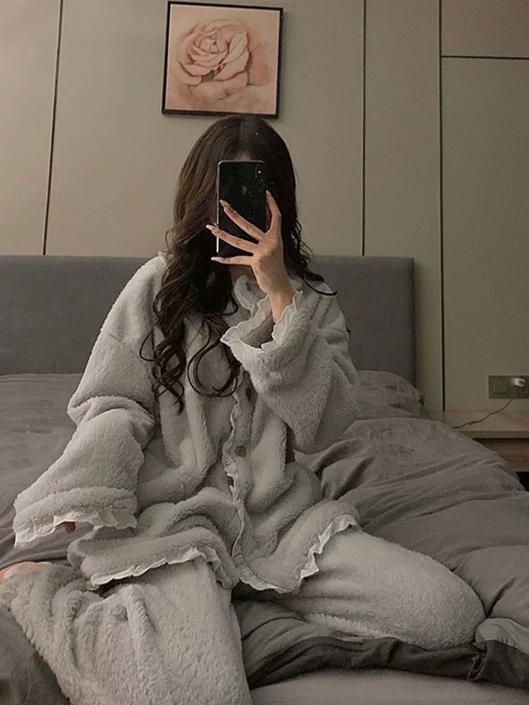 | nameOriginal | ins coral velvet pajamas women's autumn and winter Korean style plus velvet thickened lace flannel home clothes set can be worn outside |