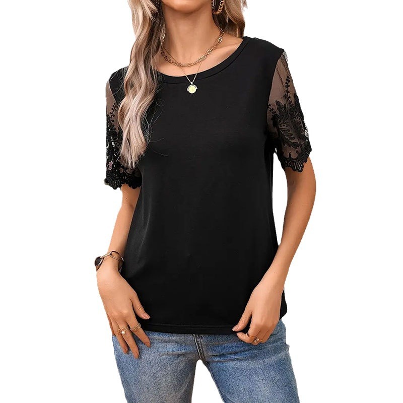 ins cross-border women's clothing 2024 Summer new elegant knitted patchwork round neck T-shirt loose mesh stitching top
