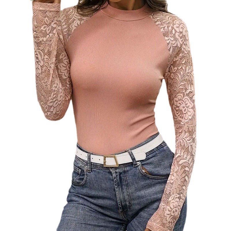 | nameOriginal | ins cross-border women's clothing 2024 Summer new elegant knitted stitching lace top small stand collar slim-fit long-sleeved T-shirt |