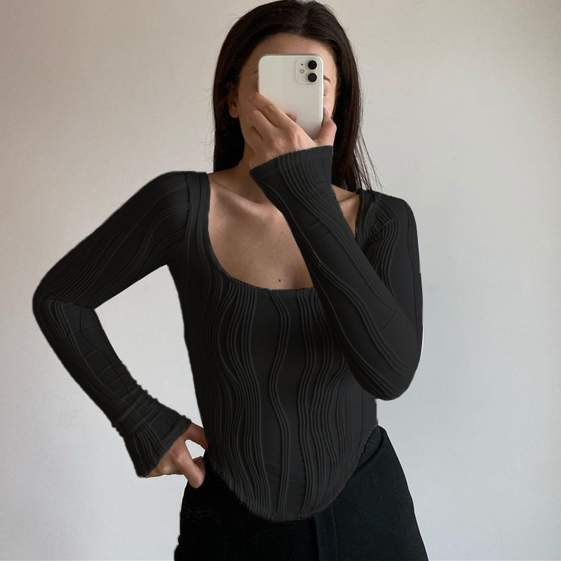 | nameOriginal | Ins Independent Station 2022 Summer French Design Pleated U-Neck Simple Solid Color Slim Long-Sleeved Top for Women |