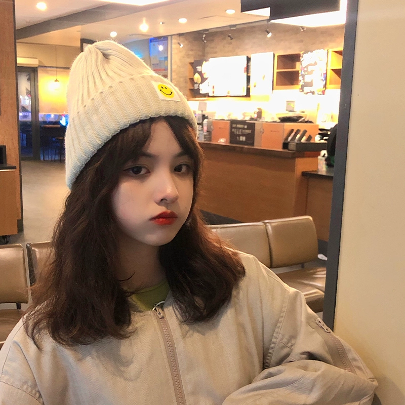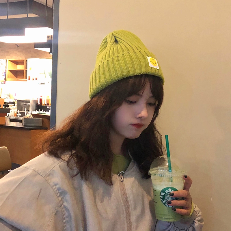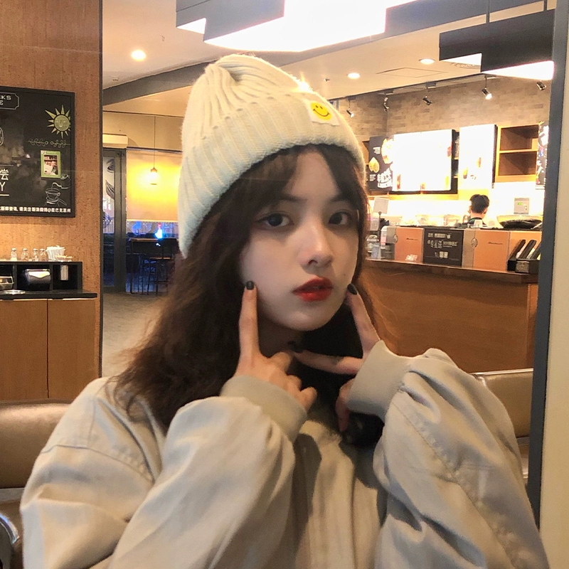 ins Internet celebrity hat women’s autumn and winter ear protection knitted beanie patch smiley Japanese Korean version versatile casual men
