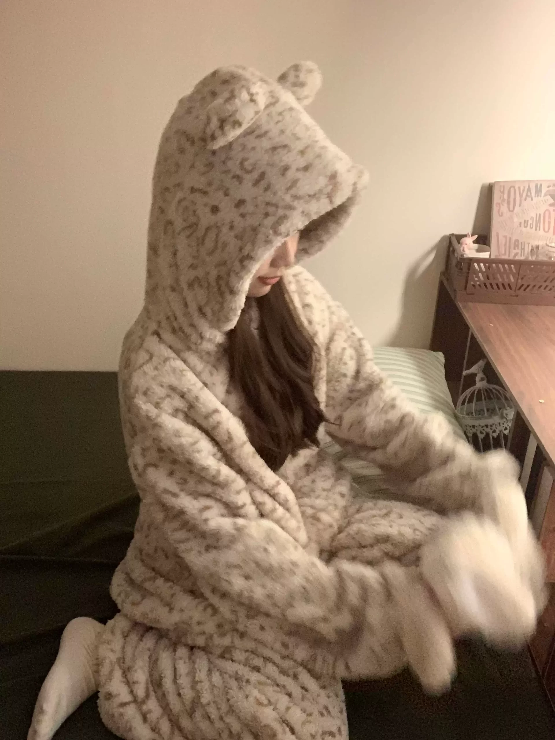 | nameOriginal | Ins Internet celebrity style leopard print hooded coral velvet pajamas women's plus velvet thickened autumn and winter new flannel large size suit |
