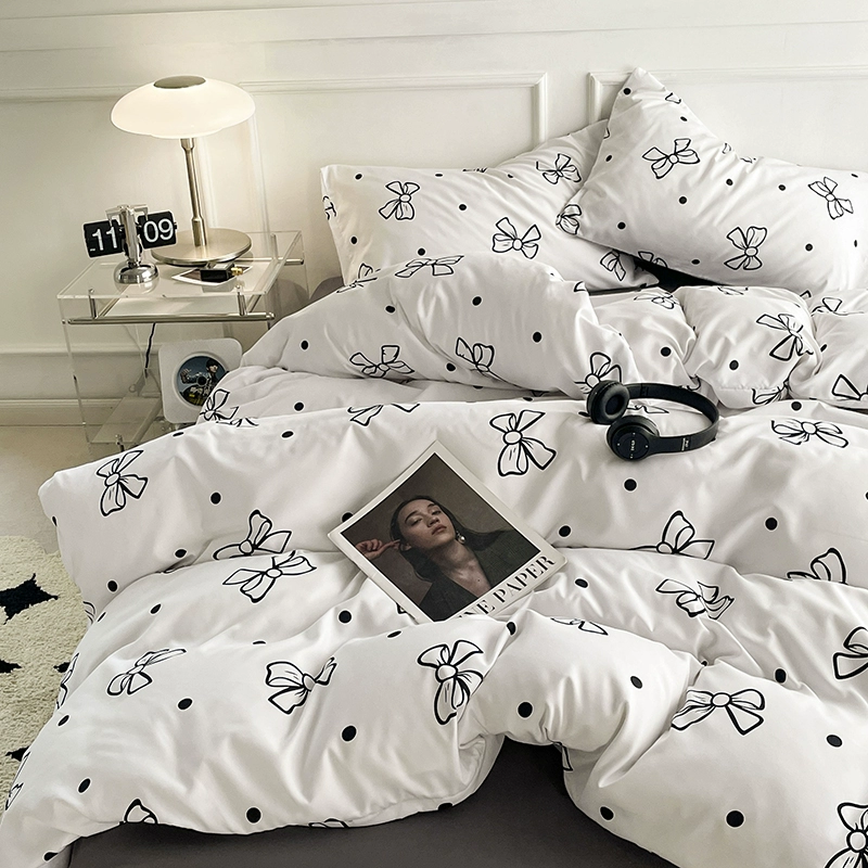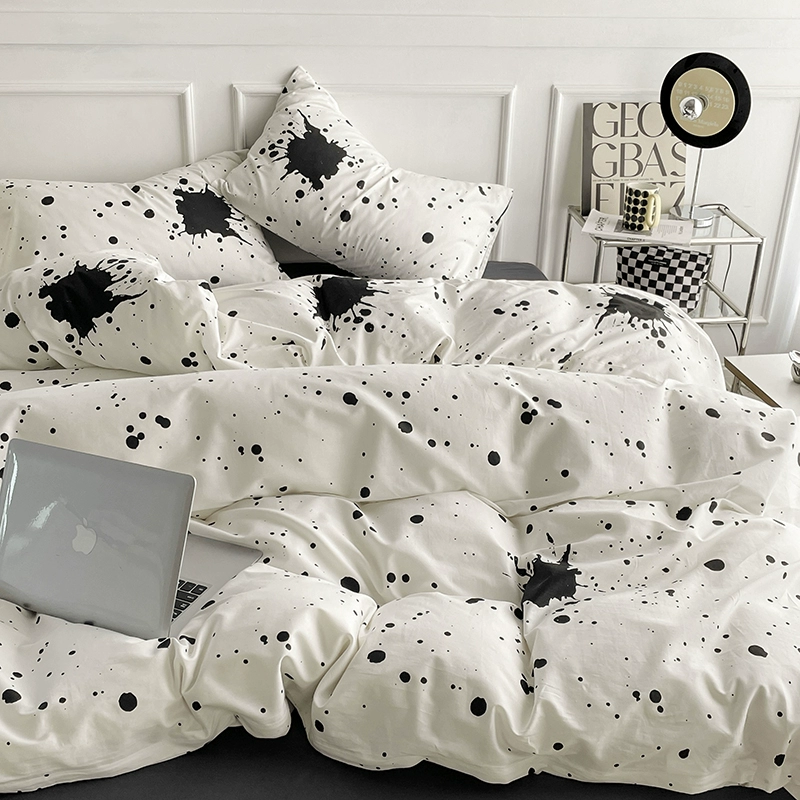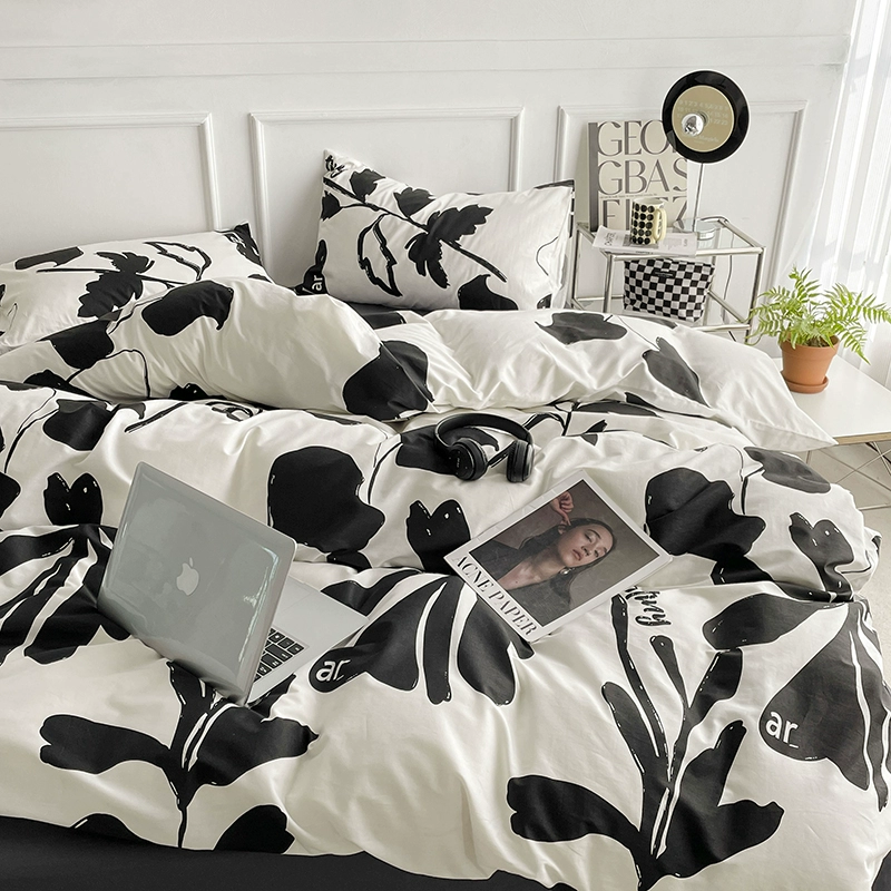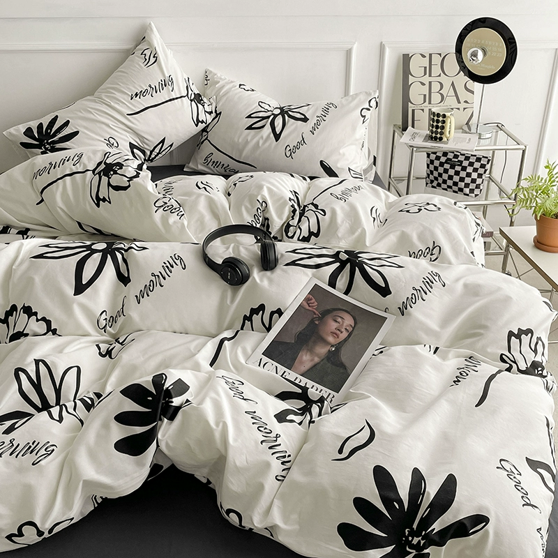 ins literary freehand style black and white letters washed cotton bed four-piece set for naked sleeping sheets and quilt cover three-piece set 4 fitted sheets