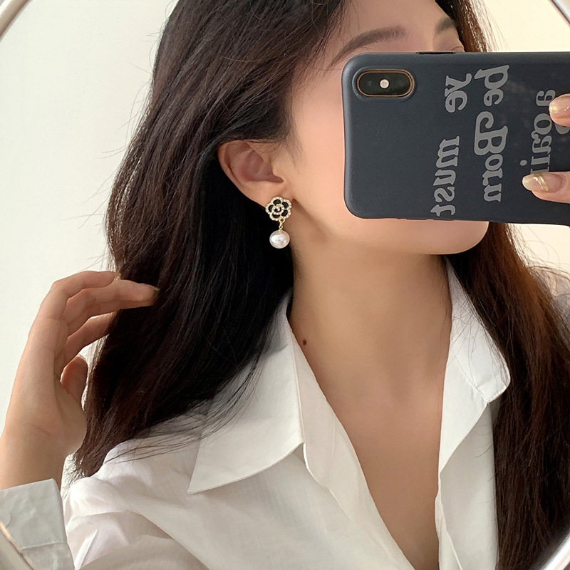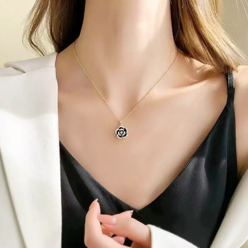 Ins Style Black Oil-dropping Camellia Three-piece Necklace Simple Light Luxury Necklace Earrings Ring suit Style Fragrant Style
