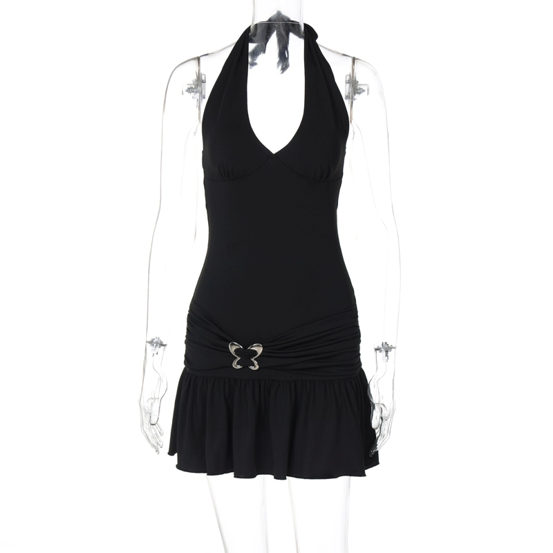 | nameOriginal | Ins style V-neck dress with butterfly buckle and pleated halter neck |