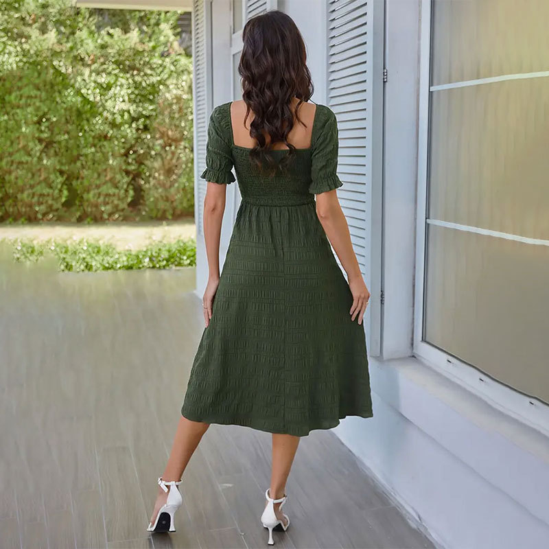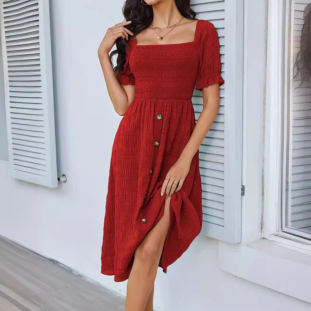 | nameOriginal | ins2024 spring and summer long dress with puff sleeves elegant short sleeve dress button decorative pleated A- line dress long skirt |