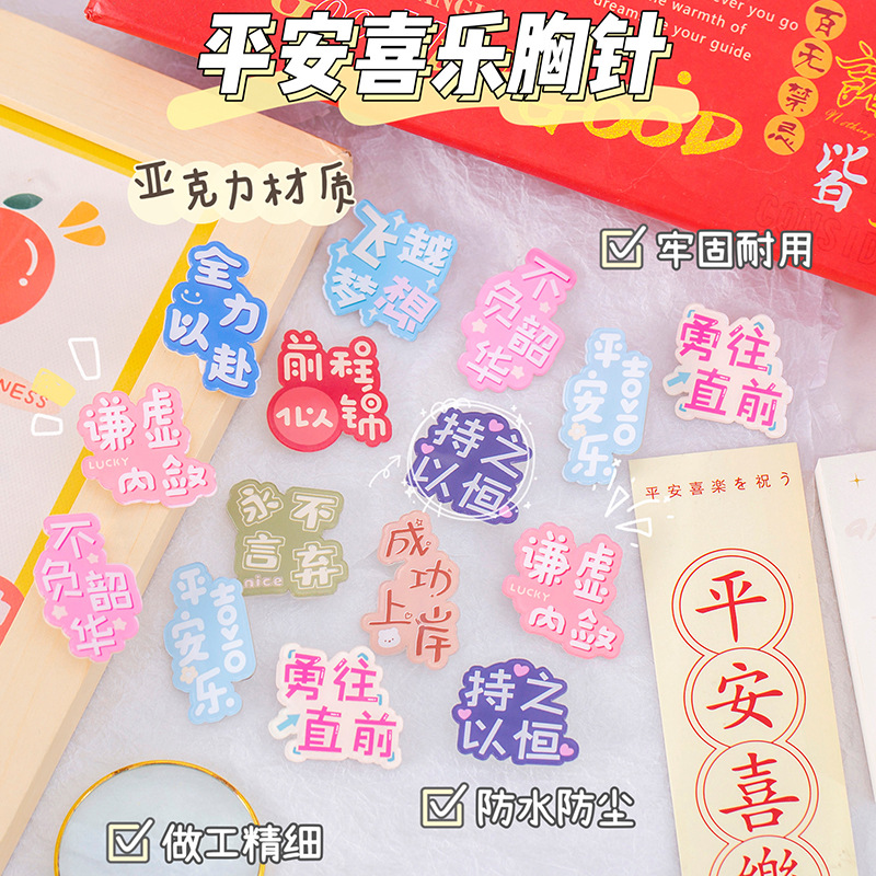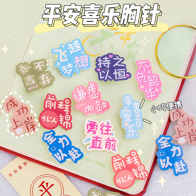 | nameOriginal | Inspirational text ping an Xi le brooch student prize portable badge children's decorative acrylic paper clip |