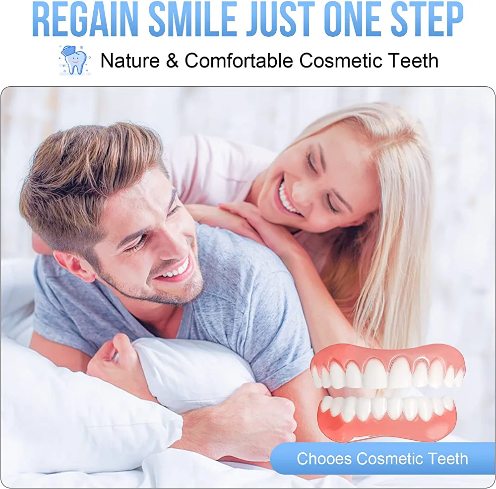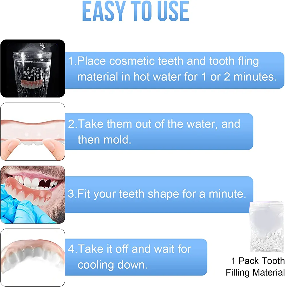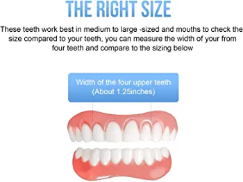 This product includes a pair of fake smile teeth that can replace your missing or damaged teeth, giving you a confident and attractive smile. The teeth are designed to cover irregularities, discoloration, and cracks, and are easy to use and clean. The teeth are made of a natural-looking material that blends in with your existing teeth, making them virtually invisible. However, it is important to note that they should not be worn during certain activities such as exercising, smoking, or drinking hot beverages for extended periods of time.