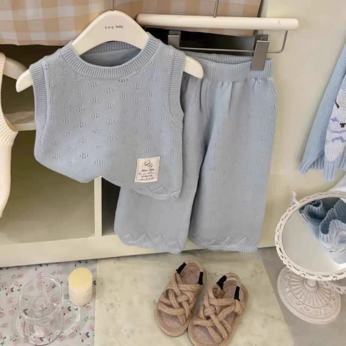 Internet celebrity children’s clothing girl thin foreign gas knitted set 2024 Xia Nubao hollow vest wide legs two -piece tide