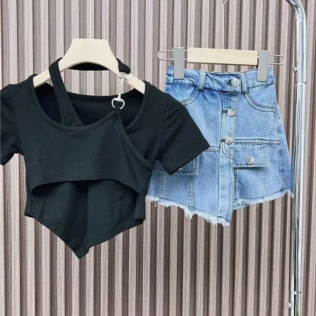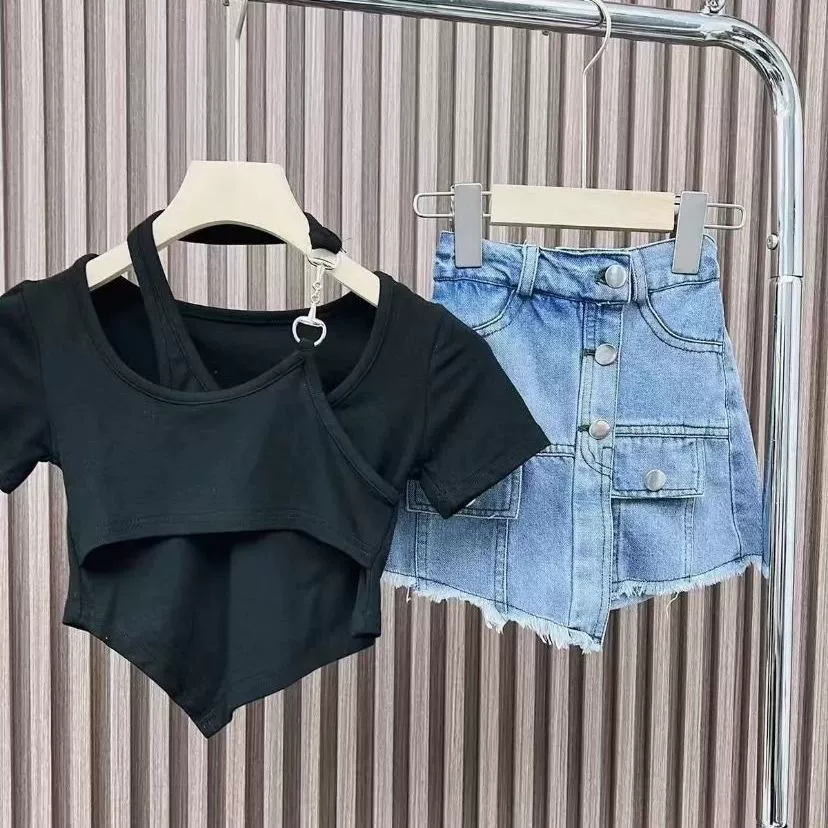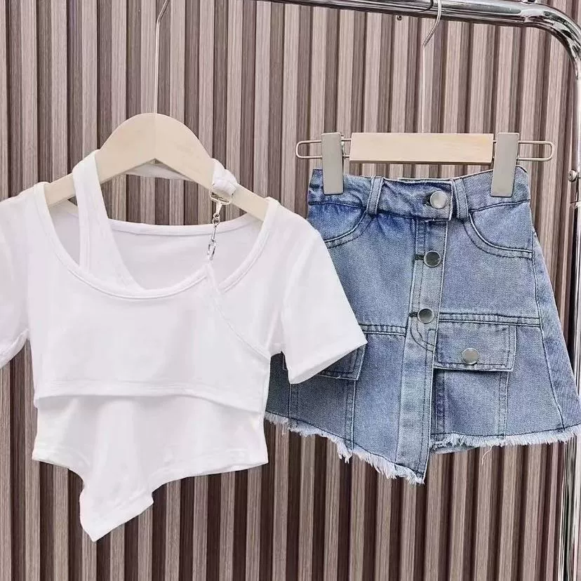 | nameOriginal | Internet celebrity fashion little girl denim skirt pants two-piece summer dress |