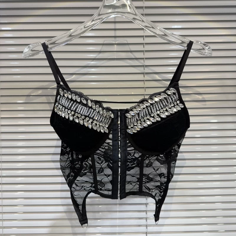 Internet celebrity lace fishbone suspender with rhinestones and beads