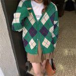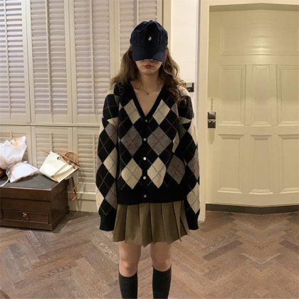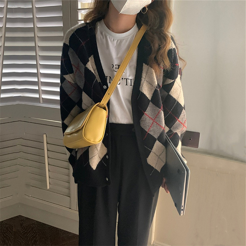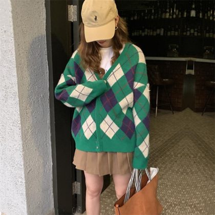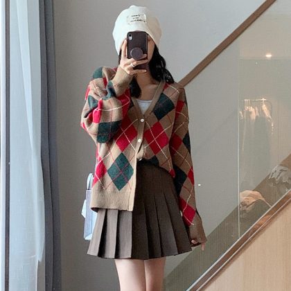 Internet Celebrity Lazy Style Contrast Color Plaid Knitted Coat Women’s Spring and Autumn New Loose Retro V-Neck Sweater Cardigan Women’s Clothing