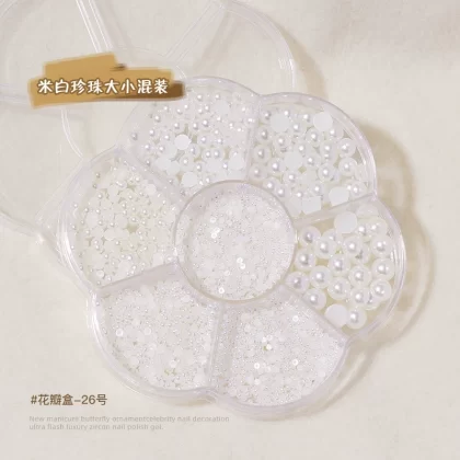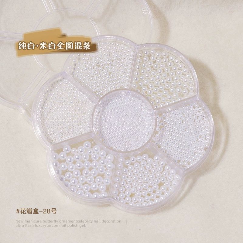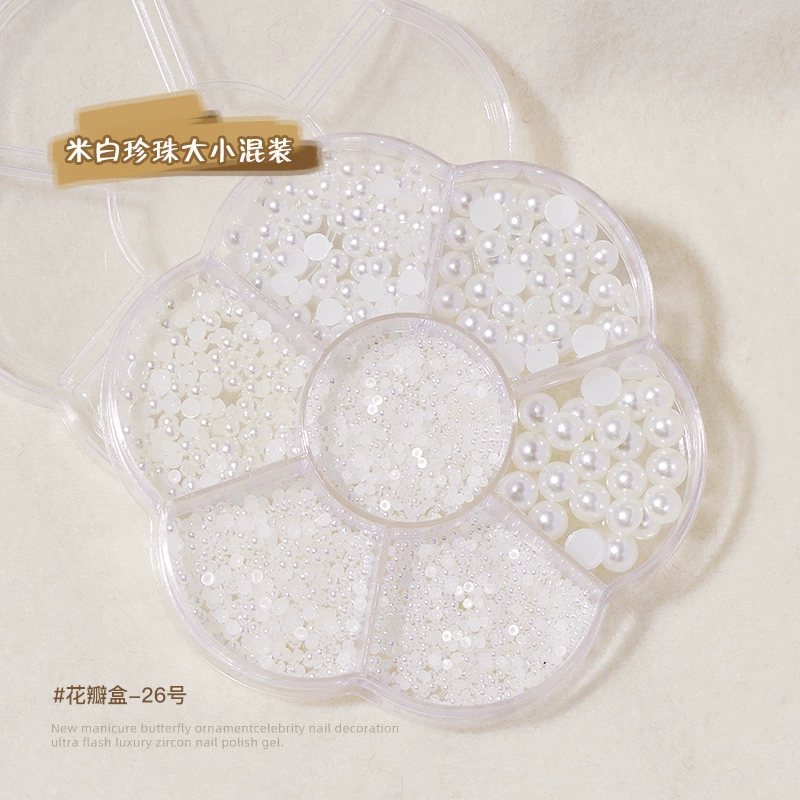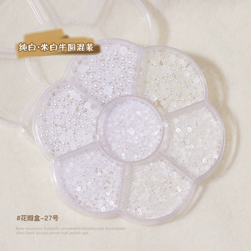 | nameOriginal | Internet celebrity nail art diamond jewelry petal box pearl high-gloss off-white pure white semi-circle flat bottom full circle size pearl mixed pack |
