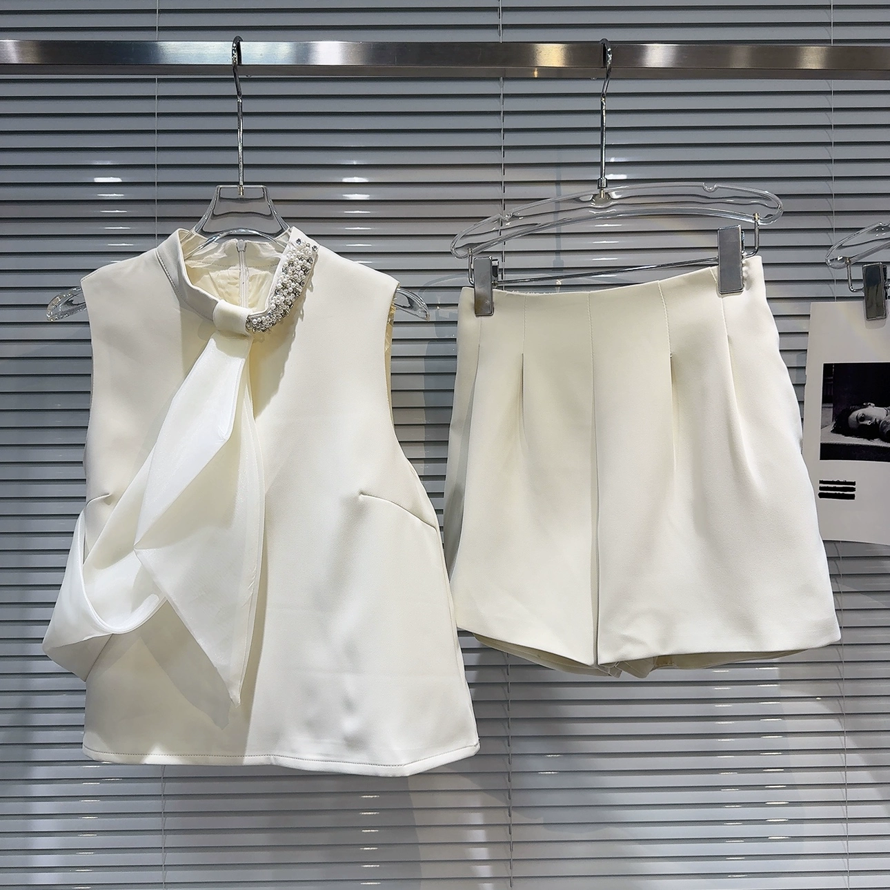 Internet celebrity Xiaoxiangfeng tie pearl vest solid color mesh