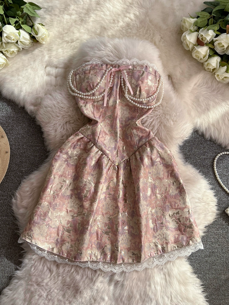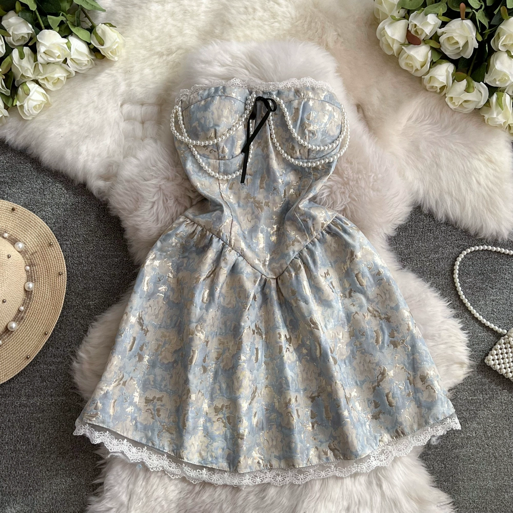| nameOriginal | Internet celebrity sweet temperament tube top lace dress women 2024 summer heavy industry bead chain jacquard puff skirt |