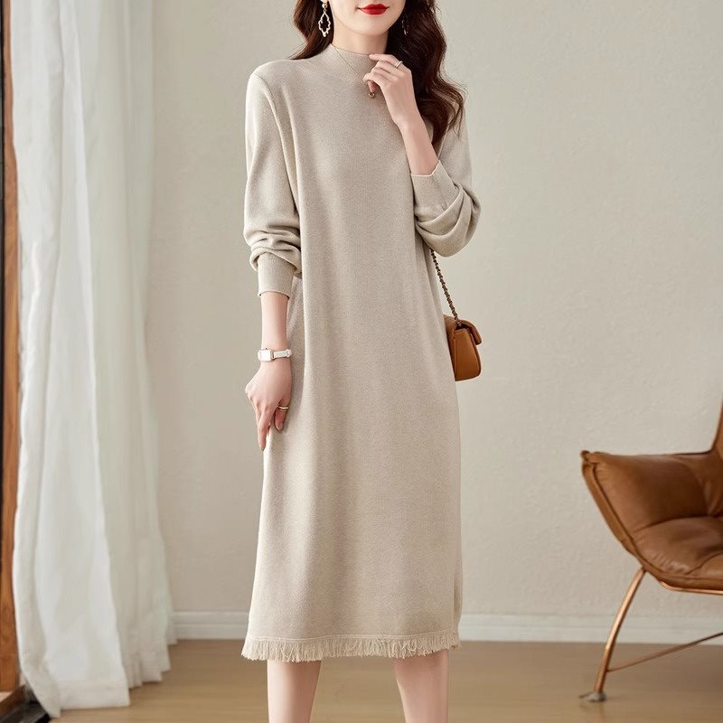 | nameOriginal | Internet Red Explosions dress Belly Covering Age Reducing 2024 Spring Flow Su Long Sleeve Semi-high Neck Long Inner Wool Dress |