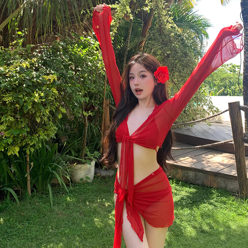| nameOriginal | Internet Red Hot 2024 New Bikini Swimsuit Women's Split Four-Piece Set Long Sleeve Sunscreen Red Vacation Hot Spring |