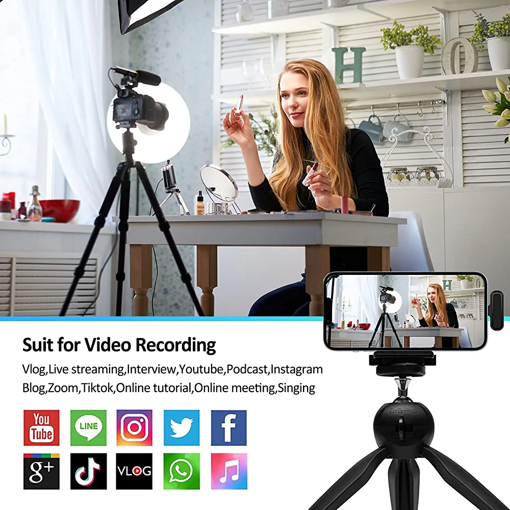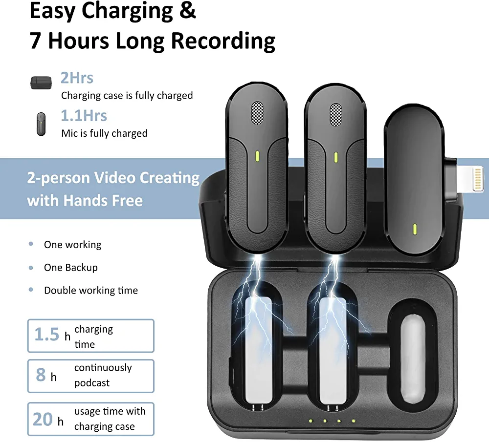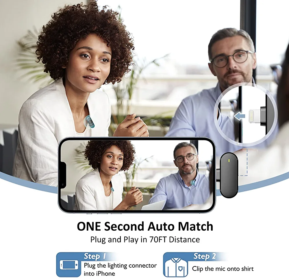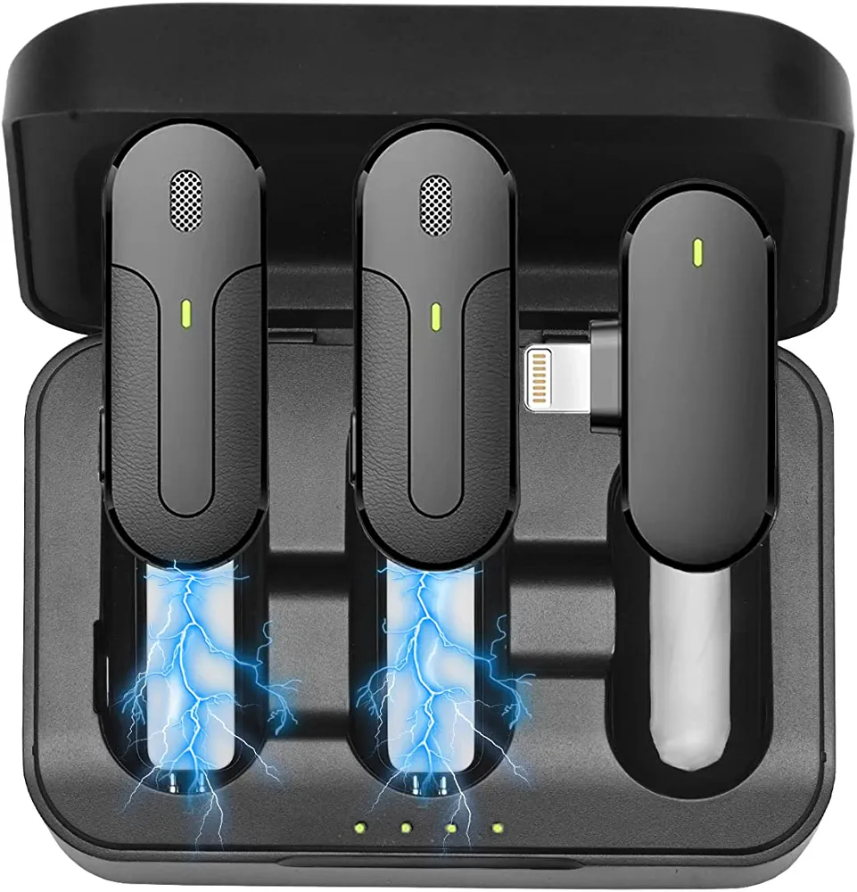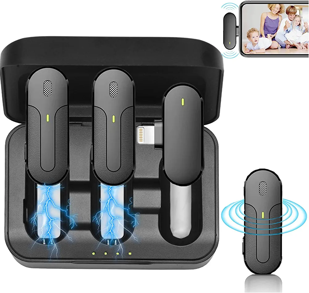 iPhone/iPad Wireless Lavalier Microphone with Charging Case and 2 Mini Mics. Ideal for Video Recording, Vlogging, YouTube, TikTok, and Interviews. Features 3 Mode Denoise and 65ft range.