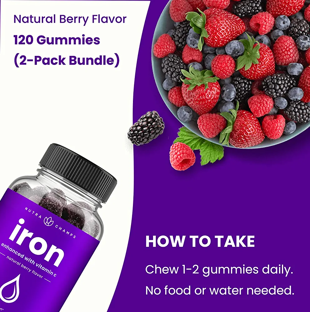 Iron Gummies, 20mg Iron Gummies for Women, Men & Kids with Vitamin C, 120 Blood Builder Iron Supplement Gummies, Vegan Iron Gummy for Iron Deficiency & Anemia, Energy, Focus, Immune Boost (2 Pack)