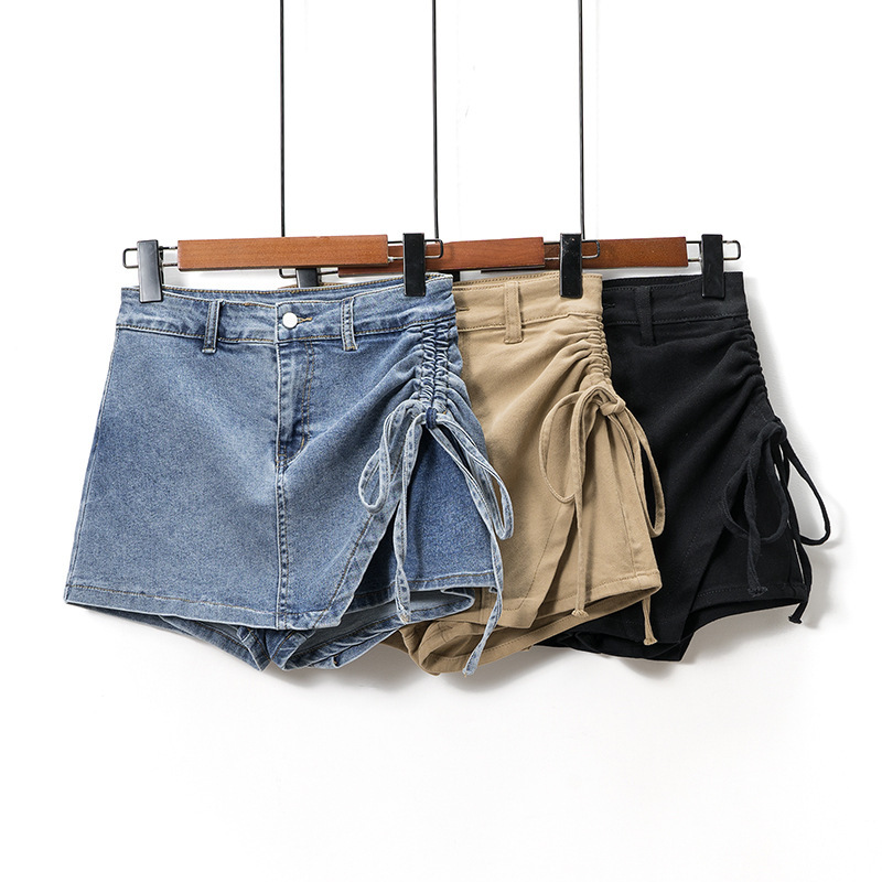 Irregular Drawstring Lace-up Pant Skirt Women’s 2023 Summer New Anti-glare Elastic Slim-fit Hip Denim Shorts