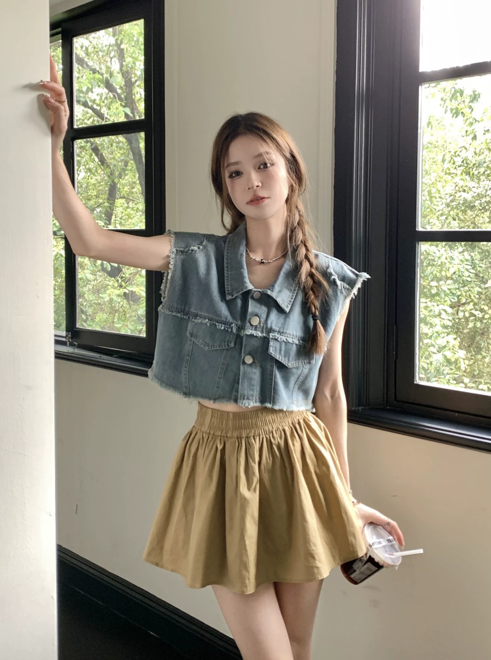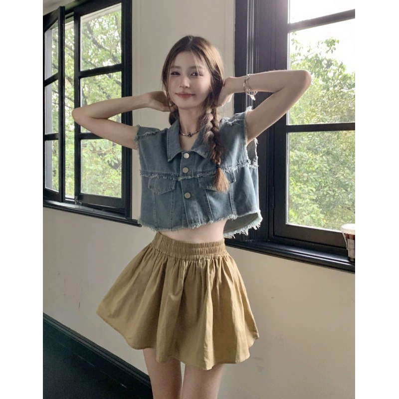 | nameOriginal | Irregular raw edge sleeveless chic distressed denim shirt |