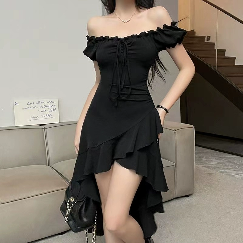 | nameOriginal | Irregular sexy one-shoulder dress summer new ruffled waist slimming halter neck strap mid-length skirt |