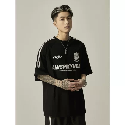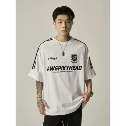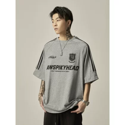 ISIETS trendy brand heavyweight three-stripe loose short-sleeved men's summer American retro high street ins couple T-shirt clothes
