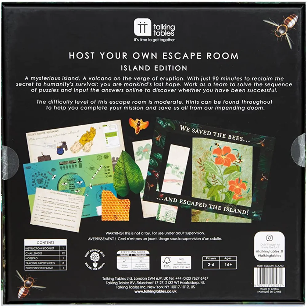 | nameOriginal | Talking Tables Island Escape Room Game for Adults Teenager, Solve Unique Puzzles & Codes to Save the Bees, Games Night, Age 16+, 2-6 Players, Birthday, Dinner Party, Christmas (HOST-ESCAPE-ISLAND) |